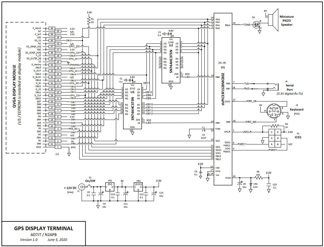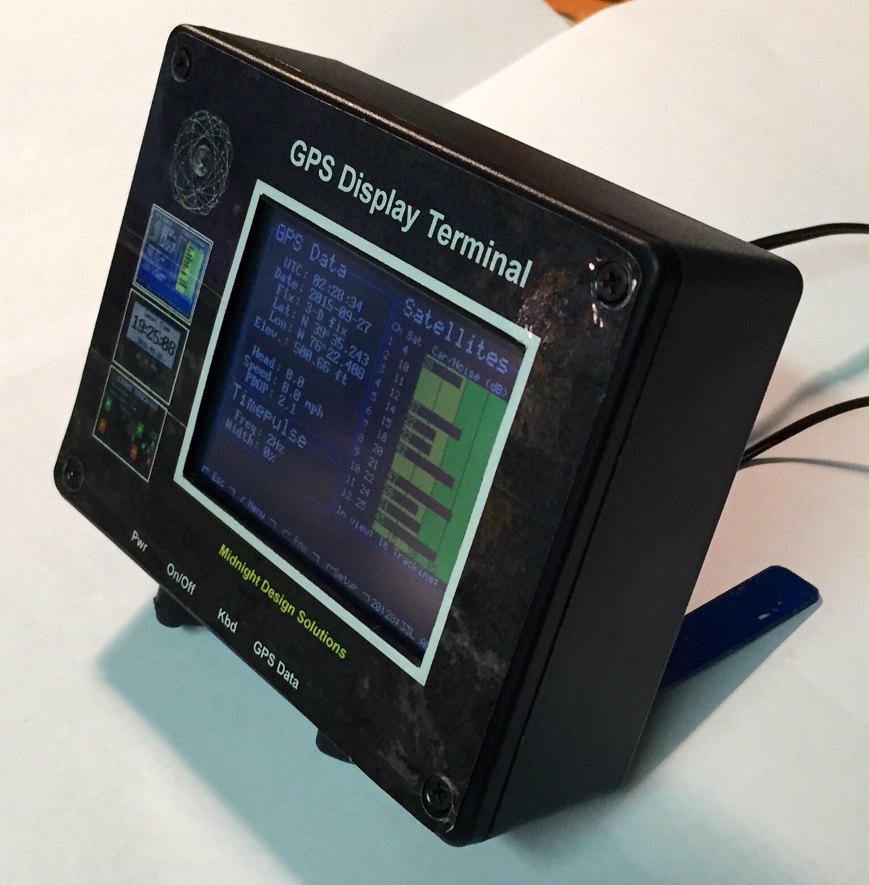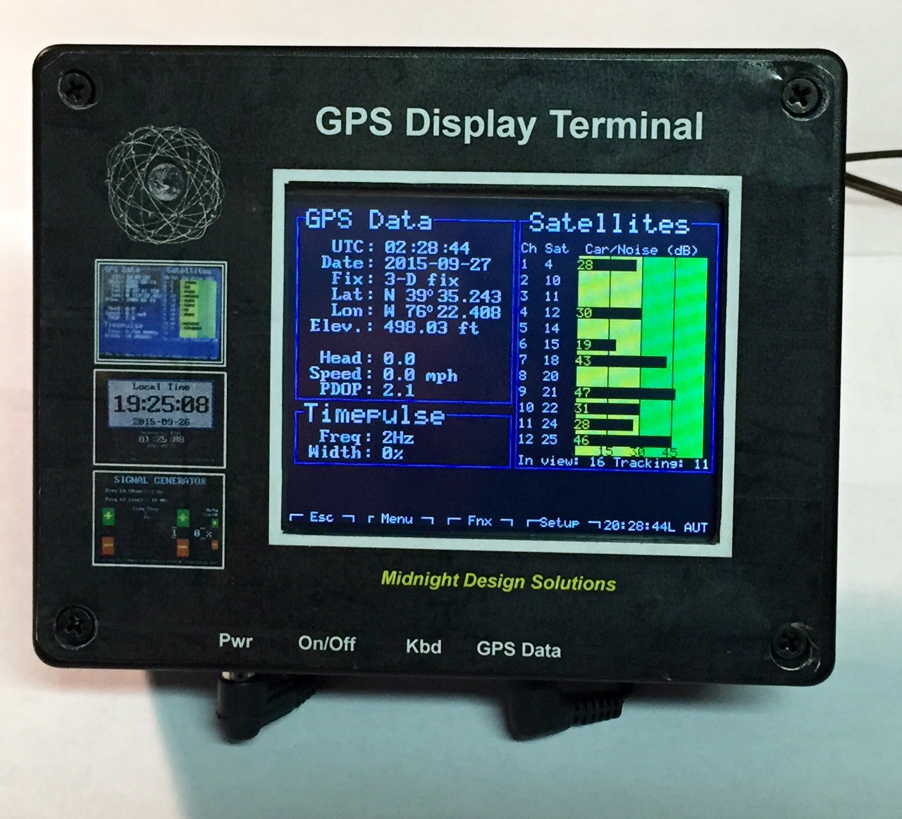The Midnight GPS Display Terminal (GDT) monitors the output of a GPS receiver and displays satellite signal strength as well as location and time information. When a Ublox GPS receiver is being used, the GDT can control the frequency and duty cycle of a timing signal generated by the GPS receiver and synchronized with the precision atomic clocks in the GPS satellites. The result is an inexpensive, very precise signal generator tunable from 1 Hz to 10 MHz in increments of 1 Hz.