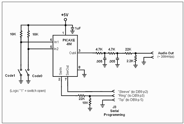 The Encoder is another board very similar to the Decoder board described above, but easily modified to produce the pulsed audio tones in the right sequence based on the settings in the two switches connected to the board. Note that a blank pc board is provided for the Encoder function in the Rookey Kit; thus you will need to populate the board according to the specific, custom way in which you wish to use the Rookey system. Several recommended modifications are shown in the Encoder section of this web page. As shown in the primary example of Figure 2, two small toggle switches are used to instruct the PICAXE microcontroller to generate the proper code for turning on functions 1, 2 3 or four on the mating Decoder board. Software for the Encoder is provided here on this web page for easy download and programming into your Rookey Encoder board.