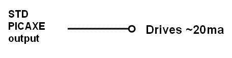 The PICAXE outputs are capable of driving simple low current loads without any extra circuitry. They will easily drive LEDs with addition of no more than a current limiting resistor. When driven high (by the program) the each output pin will provide a 5V output with up to 20 ma capability. When driven low each output pin will “sink” as much as 20 ma for a load connected to 5V.
