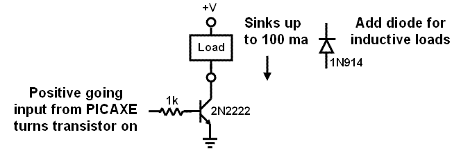 When a connected PICAXE output pin goes high, it turns the transistor on and when it goes low the transistor turns off. The load to be driven is connected between a positive voltage of choice (up to 35V or so) and the driver transistor. A common NPN silicon transistor such as the 2N2222, 2N3904 or 2N4401 will drive a load of up to 100 ma or so quite well. If the load is inductive, such as a motor, an actuator or a relay, a diode needs to be connected as shown to “snub” the inductive spike generated when the transistor turns off.