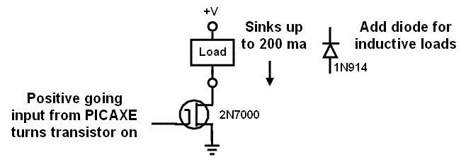 Even simpler is the Mosfet driver shown above. The PICAXE output pin is connected directly to the device’s gate with no need for a current limiting resistor. The 2N7000 will drive 200 ma loads connected to supply voltages up to 60 V. As with the bipolar transistor a “snubbing” diode is required to protect the device when using inductive loads.