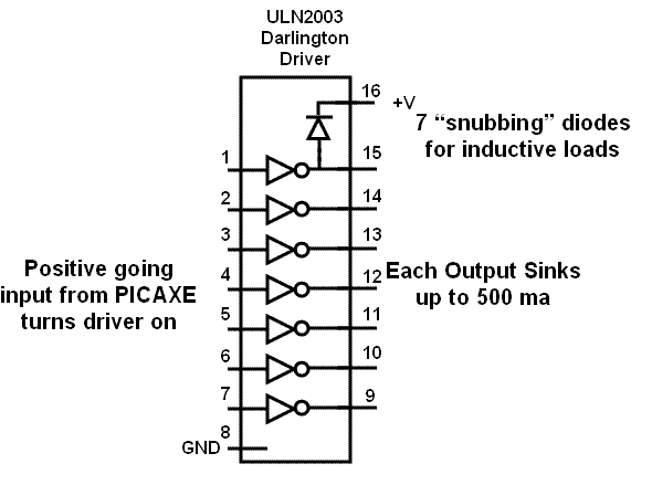 There are also IC’s designed specifically for driver use. A handy one is the ULN2003 which has seven drivers in one 16-pin DIP as shown schematically below.
