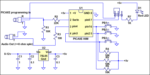 After thinking a bit, I realized that the Random Morse Generator is not a great teaching tool, so I provided a new version that incorporates the ability to do Farnsworth style sending.  I call this program The Koch Method Morse Trainer program, and the PICAXE program for this is called KMMT.bas. (Right-click this BASIC program and Save As ... to your local computer.)