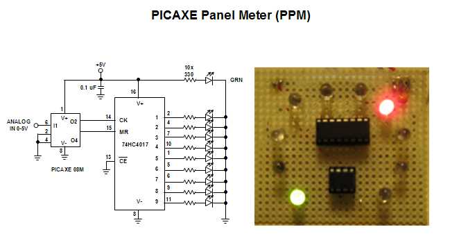 Here’s a simple project to highlight the versatility of the PICAXE 08M microcontroller chip. It makes use of its internal analog to digital converter and provides a usable output interface conserving its limiting pinouts.